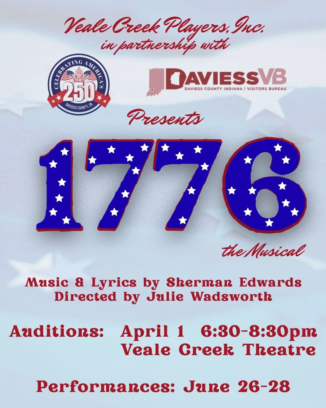 Celebrate the 250th birthday of America with the Veale Creek Players in their production of 1776. It will be performed in collaboration with Daviess County 250 and the Daviess County Visitors Bureau.